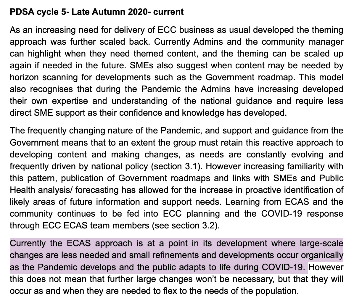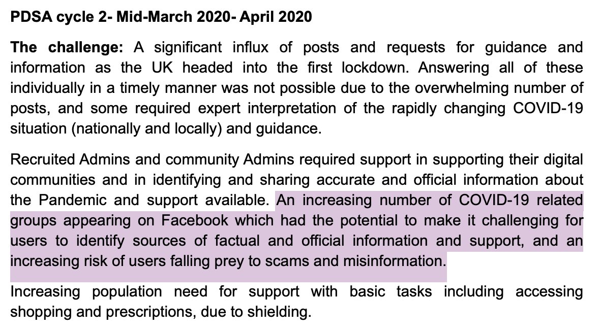 They state that this piece of work was vital in getting to the heart of communities. But I would argue that people were already conditioned to receiving information directly from government through official and social media based channels. For example, the vast majority of people would likely have tuned in to see the regular media briefings by Boris Johnson and others. It is logical to assume that they would then look to their local authorities to understand how the rule changes etc. were being implemented and what their local authority was doing. Essex City Council could have capitalised on this by centralising announcements on their existing social media properties. They did not need an entirely separate Facebook page and private(!) groups to achieve this. It would have been straightforward to set up a page on the council website detailing updates, rule changes, etc. and simply had existing, official social media channels point there.