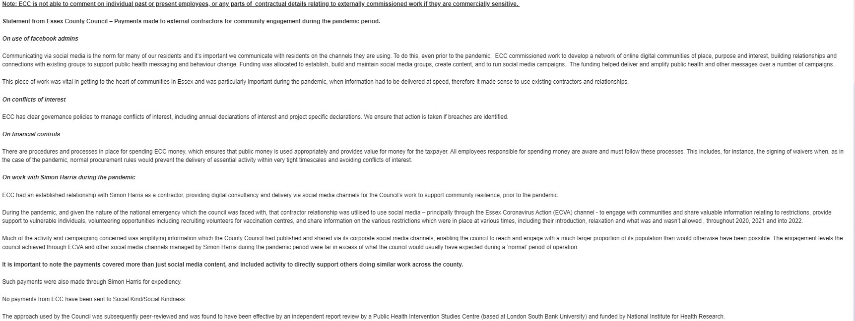 "No payments from ECC have been sent to Social Kind/Social Kindness." That is a simple matter of fact because it is true, however it does not address the conflict of interest inherent in the relationship between Simon Harris and Kirsty O'Callaghan because she was in a management role as part of the team procuring the services.