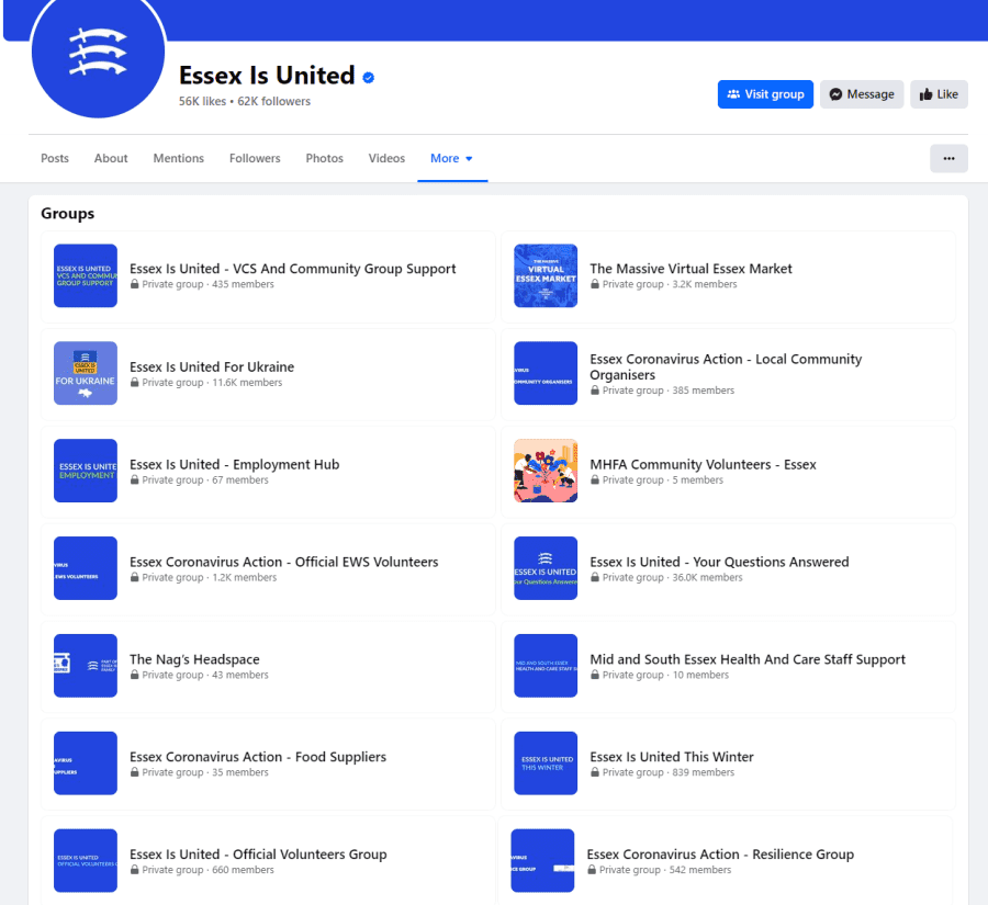 Notably, normal procurement and spending rules were abandoned by Essex County Council during the pandemic, which seems to have helped contribute to such a large amount being spent on a single individual. The council's own Audit and Scrutiny committee had a lot to say on the matter—but I'll leave that for a separate article as it doesn't directly relate to Simon Harris. It turns out that the “social media services” were for a series of Facebook pages and associated groups, quite a number of them in fact. The “main” page and group was called Essex is United and was used primarily to communicate “important updates” from Essex County Council that allegedly couldn't reach people if communicated through official channels.